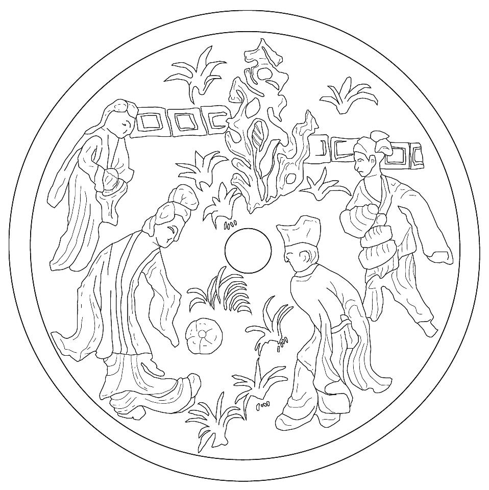 蹴鞠紋鏡は、男女が園庭で蹴鞠(しゅうきく)をして遊ぶ情景が鏡の裏面に表されています。